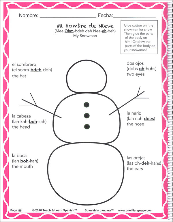Teach & Learn Spanish curriculum. The January book is 90 pages long and includes 19 activities plus 18 CD tracks. Highlights from the January book include putting a melting snowman together while learning parts of the body in Spanish. Next you'll sing and act out the song Frosty the Snowman! You'll also learn the Happy Birthday song so from now on you'll be able to sing Happy Birthday to classmates, family and friends in English and in Spanish! You'll play The Ball Game and The Snowflake Game which teach numbers and counting. The games are so much fun to play that kids hardly realize they're counting in a second language! These are just a few of the exciting activities from the Teach & Learn Spanish in January book and CD.