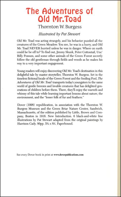 Young readers will enjoy discovering Old Mr. Toad's destination in this delightful tale by master storyteller, Thornton W. Burgess. Set in the timeless fictional locale of the Green Forest and the Smiling Pool, this book transports today's youngsters to the same world of gentle breezes and lovable creatures that has delighted generations of children before then. There, they'll enjoy the warmth and whimsy of this tale while learning important lessons about nature, the environment, and the "lesser folk of fur and feathers."