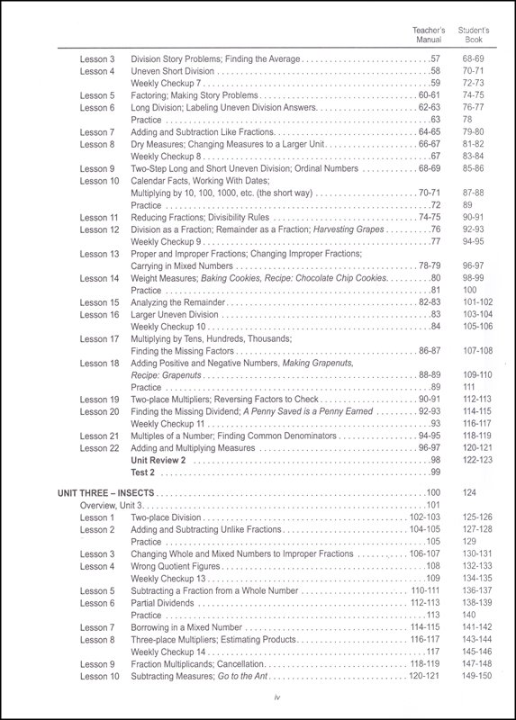 The content of the curriculum is solid and moves at a brisk pace. The lesson sequence is similar to the Saxon methodology in which each lesson presents a different topic and builds on previous lessons. Review is ongoing and found in daily lessons, weekly practice pages, weekly check-ups, and unit reviews - students don't run the risk of forgetting previously learned concepts. Along with math concepts that you would typically expect from your curriculum, students are introduced to math application skills like checking and savings, finding original prices and discounts, record keeping, taxes, and more. When learning about money, the curriculum includes both U.S. and Canadian coins.