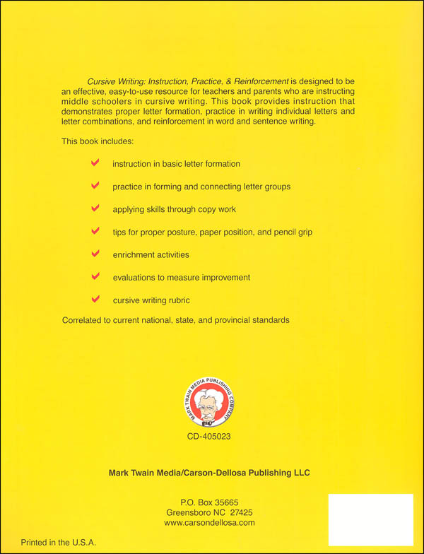 Ideal for students who are new to cursive writing and those who need a refresher, Cursive Writing: Instruction, Practice, and Reinforcement for fourth to ninth grades provides step-by-step instruction and practice in cursive handwriting. This Cursive Handwriting practice book provides real-world examples that motivate students to perfect their handwriting.