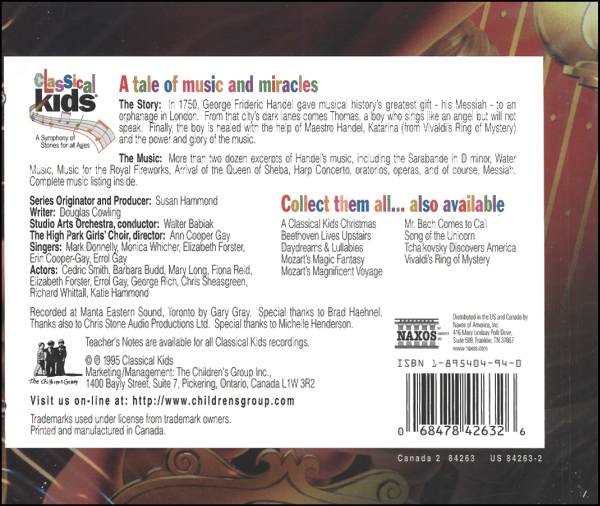 In a darkened room behind London's famous Opera House there is a young, orphaned boy (Thomas) who sings like an angel but refuses to speak. Young Katarina (introduced in Vivaldi's Ring of Mystery) has left France with her grandfather, the Duke. In London, she meets the great composer Handel at a party, where they are captivated by Thomas who "sings like an angel." Katarina and the composer are enthralled by his talented voice. Handel's generosity and kindness toward this boy and the sharing of his past help earn Thomas's trust and heal his spirit - inspiring him to use his beautiful voice in song and speech. More than 30 excerpts of Handel's music are featured, including Julius Caesar, Rinaldo, The Messiah, Water Music, Fireworks, the Harp Concerto and several flute sonatas.