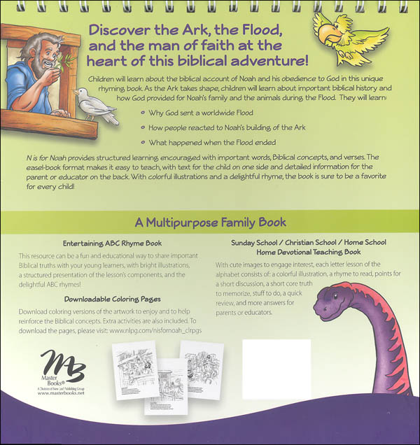 This teacher-directed Bible book alphabetically presents the importance of trusting God's promises using the story of Noah and the flood. Using the tent format book, the teacher presents the lesson from one side while the student views the cartoon-illustrated, poem-format story on the opposite side. Each story highlights an alphabet letter and a tangible or Biblically-themed word such as "R is for Raven" or "C is for Called." The low-prep teacher's portion includes the story and a scripted-format lesson using activities and questions that review and expand upon key ideas and additional vocabulary using the same letter. By Ken /Mally Ham; resource for the Biblical Beginnings for Preschoolers program. Top spiral bound, 84 pp, hc. ~ Ruth